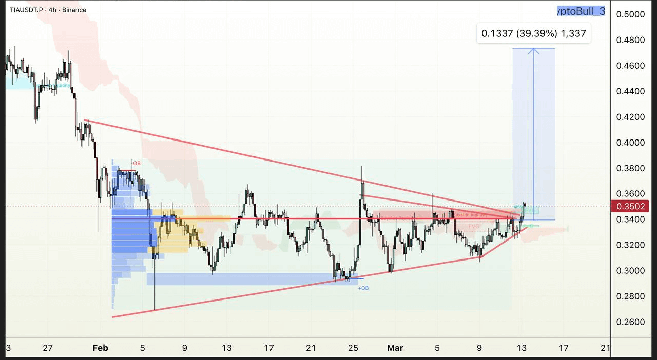 If price breaks above the triangle resistance, the chart projection shows a potential move toward $0.48 roughly a 35–40% expansion.