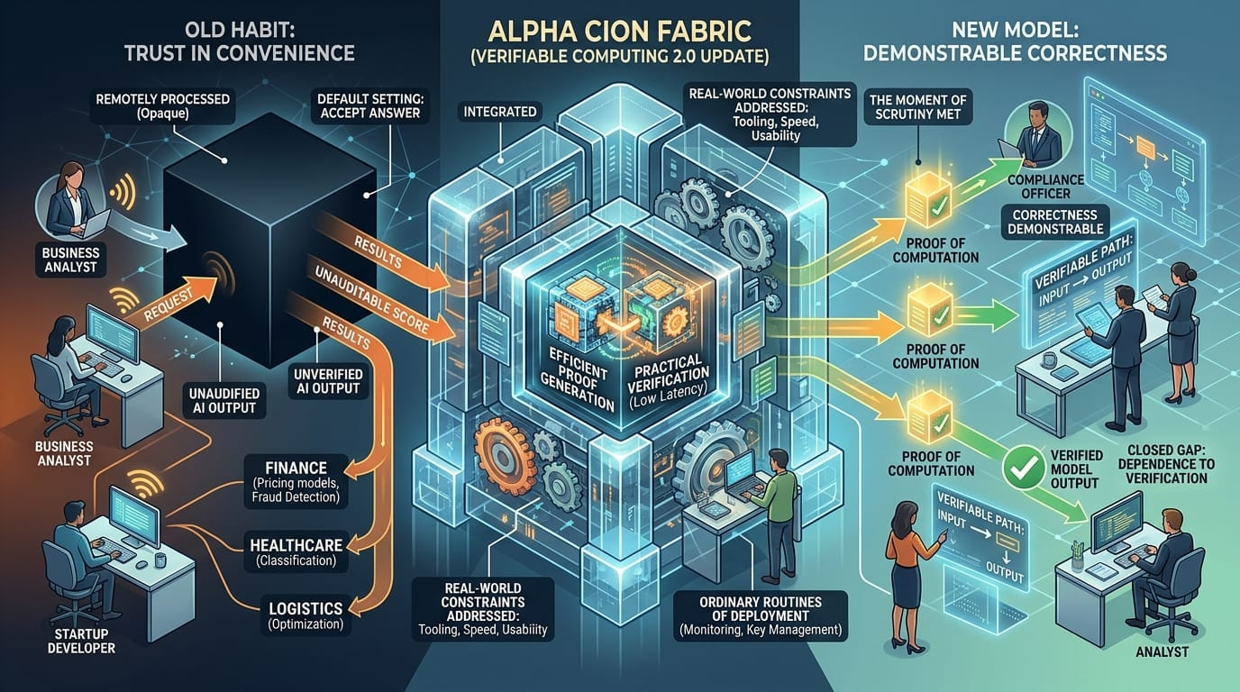 That is the backdrop for Alpha CION Fabric’s future update. Whatever branding sits around it, the underlying challenge is real. A verifiable system is not just one that produces a result. It is one that can produce evidence about how that result was obtained, in a form that another party can check without taking the entire workload back in-house. That changes the conversation from “trust me” to “verify this,” which sounds subtle until you think about where the friction lives. In finance, a model output can influence credit, pricing, or fraud detection. In healthcare, a remote system might process sensitive data and return a classification that affects treatment steps. In logistics, an optimization engine may assign routes, costs, or priorities across a network no single participant fully sees. In each case, the result matters. So does the ability to prove that the process was sound.