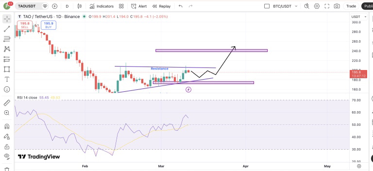 На момент написания TAO торгуется около $196,4 после отката от зоны $207, где ранее фиксировалась прибыль.