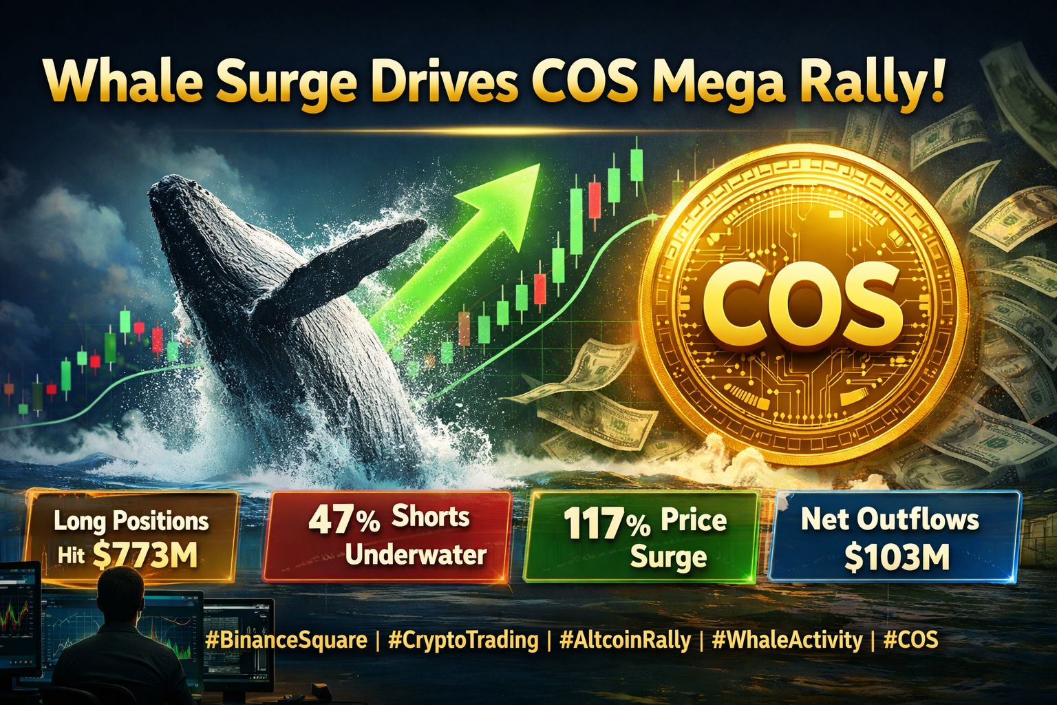Crypto market mein aaj sab se zyada discussion $COS token par ho raha hai, jahan price ne sirf 24 ghanton mein 117% ka explosive rally dikhaya. Yeh move sirf retail buying ki wajah se nahi, balkay strong whale activity aur short squeeze setup ki wajah se hua hai, jo is rally ko aur zyada aggressive bana raha hai.