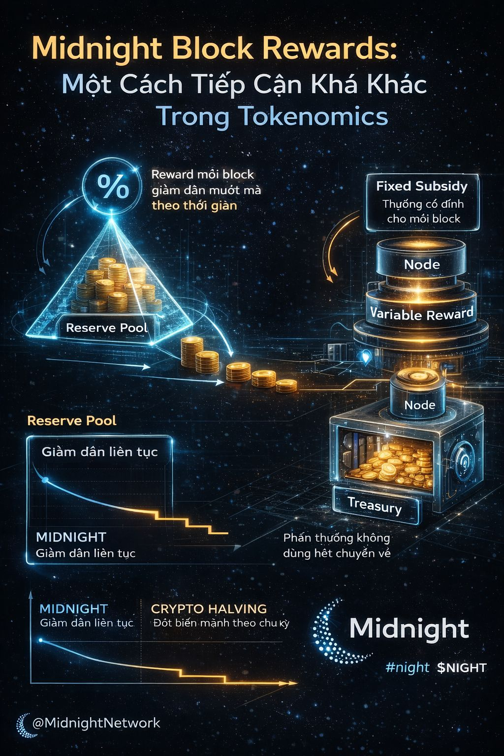 Điểm mình thấy đáng chú ý là mô hình này tránh được những cú sốc nguồn cung lớn như halving. Thay vì mỗi vài năm reward giảm mạnh một lần, Midnight chọn cách để phần thưởng giảm dần một cách mượt mà theo thời gian.