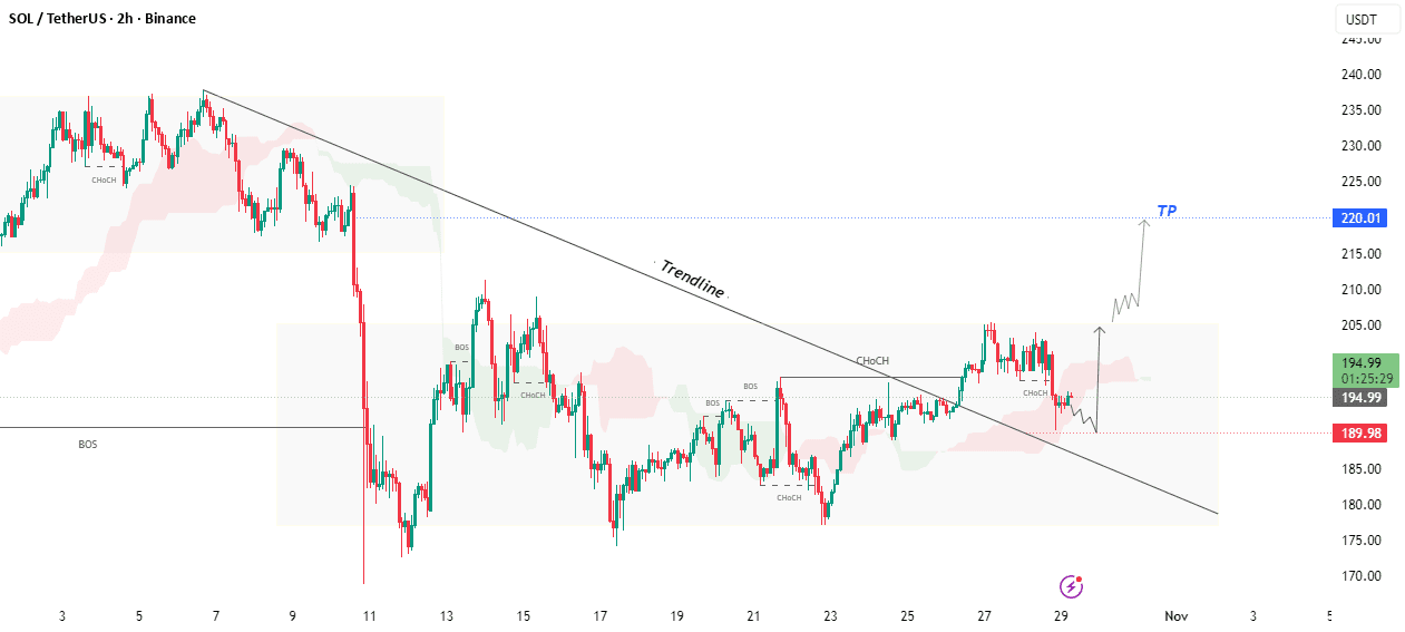 SOLUSDT na wykresie dwu godzinnym pokazuje silny wzrostowy momentum po złamaniu struktury (BOS) i zmianie charakterystyki (ChoCH) powyżej linii trendu spadkowego. Przebicie wskazuje na możliwość odwrócenia trendu z spadkowego na wzrostowy.