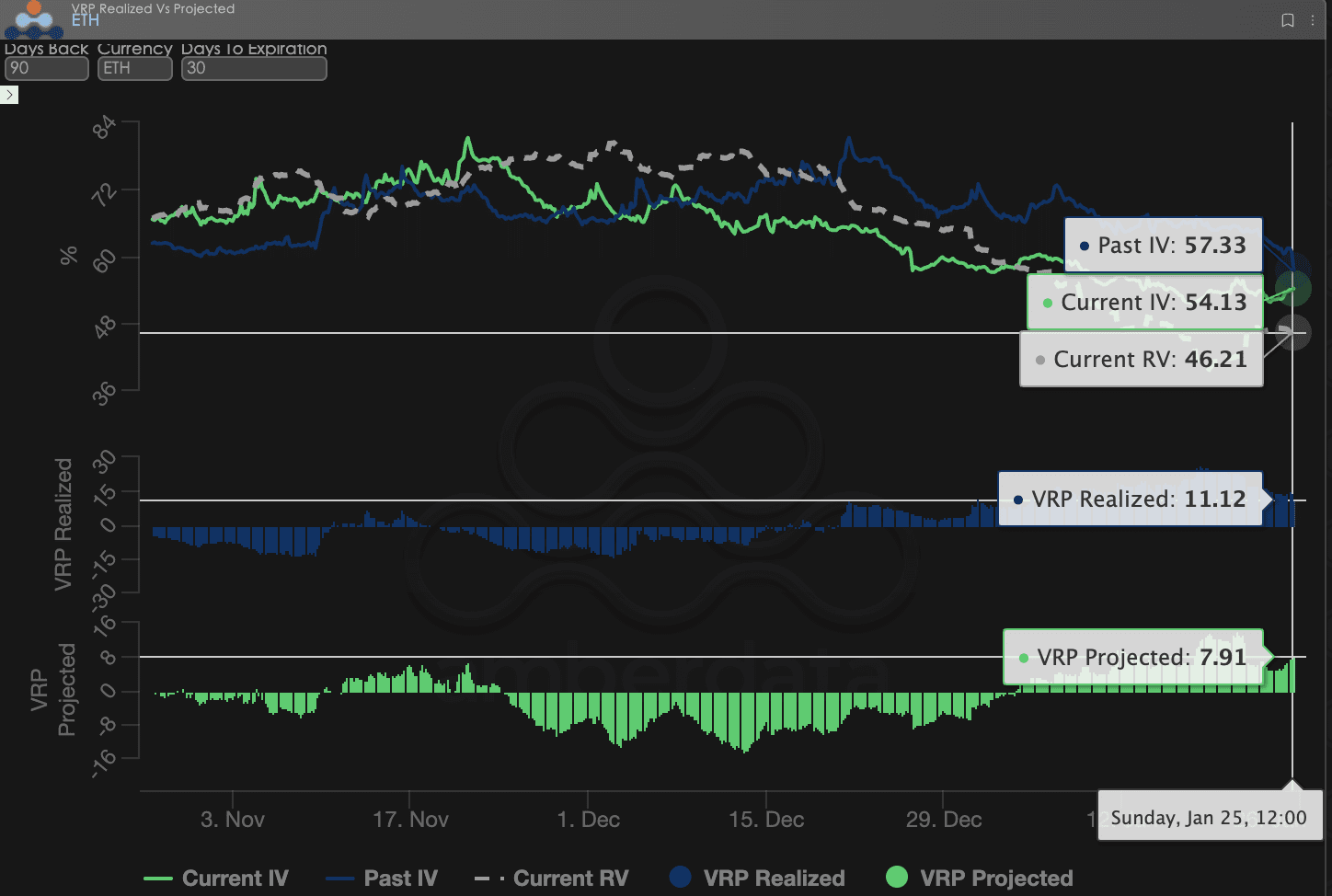 VRP (premia za ryzyko zmienności = implikowana zmienność IV - zrealizowana zmienność RV) jest ważnym wskaźnikiem oceny, czy wycena opcji jest uzasadniona. Obecnie rynek znajduje się w fazie korekty.