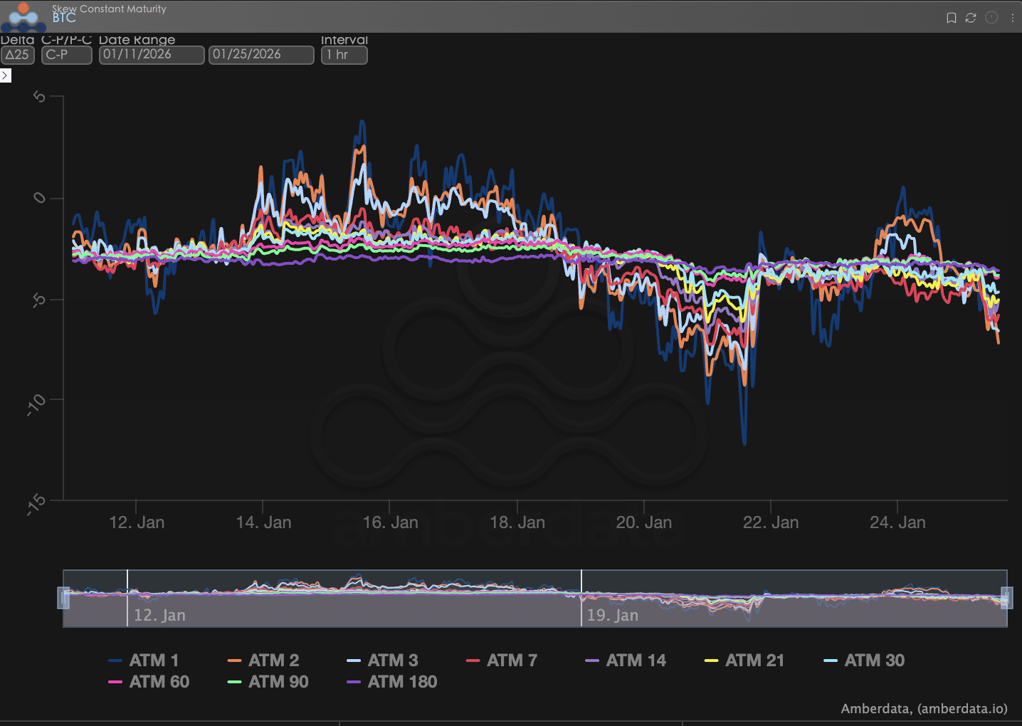 Poprzez obserwację Delta 25 Skew (implikowana zmienność IV opcji call - IV opcji put), zakres wartości ujemnej tego wskaźnika odzwierciedla popyt rynku na zabezpieczenie ryzyka ogonowego.