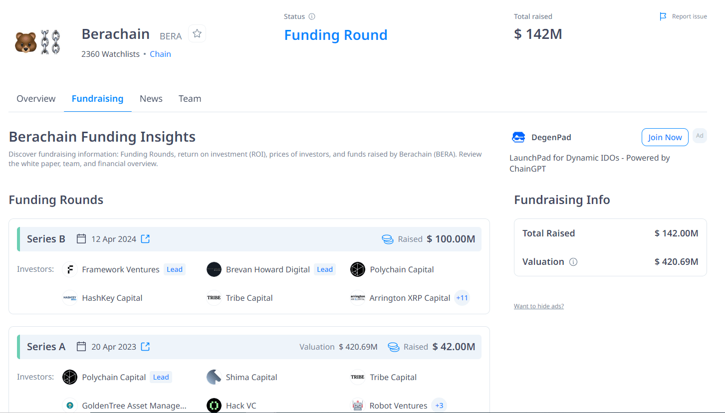 A $BERA levantou US$ 142 milhões em investimentos de @polychain @hack_vc @tribecap @Nomura @HashKey_Capital e outros.
