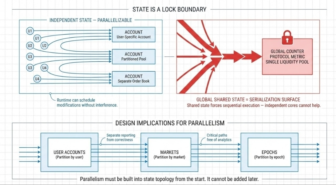 A implicação arquitetônica é severa: cada objeto compartilhado e gravável se torna uma superfície de serialização. Um contador global que é atualizado em cada negociação, uma métrica em todo o protocolo que é recalculada por interação. Há uma conta de pool de liquidez para todas as trocas. Quando o tráfego é baixo, essas escolhas de design parecem razoavelmente seguras. Quando o tráfego é alto, elas representam o limite superior da escalabilidade.