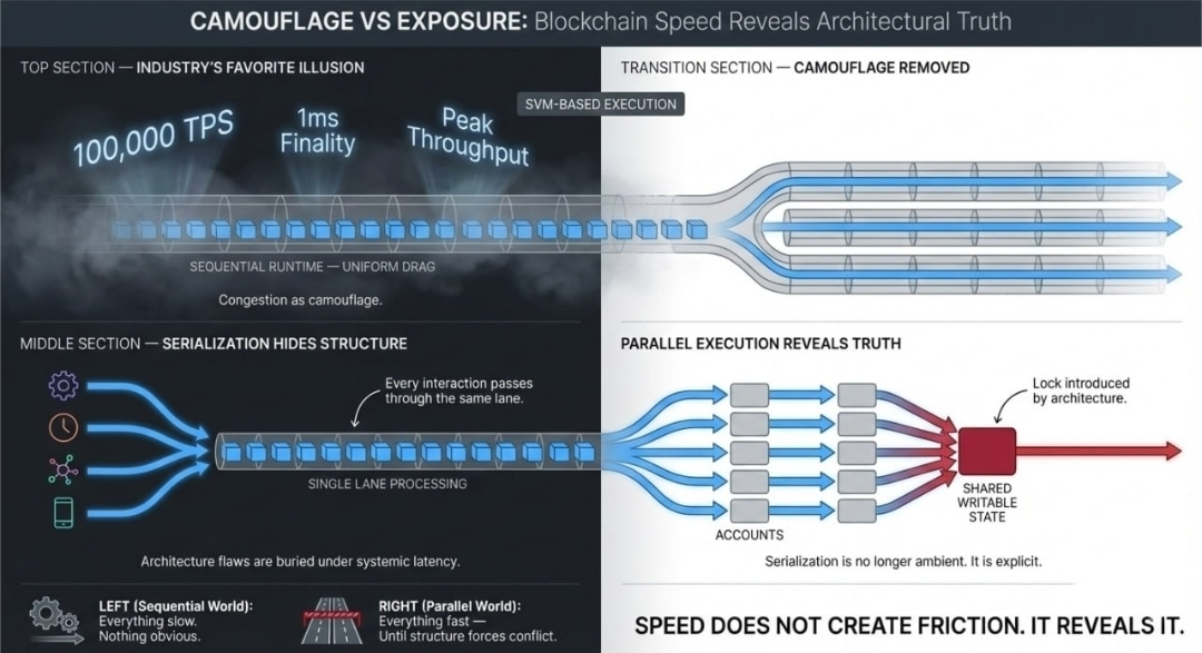 Ao olhar para os tempos de execução sequenciais, as fraquezas estruturais estão bem ocultas. As transações se alinham. Os blocos são preenchidos em ordem. Cada interação passa pela mesma faixa de processamento estreita. E, como tudo é serializado por padrão, cada aplicativo parece estar sujeito à mesma resistência sistêmica. A Latência Ambiente é uma propriedade aceita do ambiente em vez de um sinal diagnóstico.