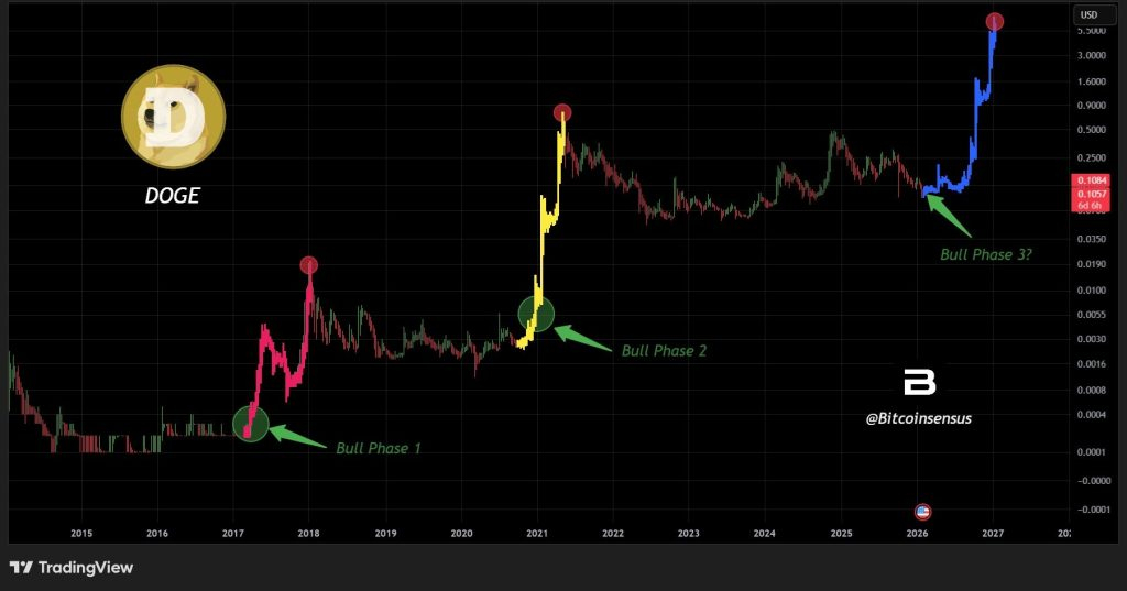 O gráfico projeta um possível movimento em direção à zona de $5, com base em quão extremas foram as corridas cíclicas anteriores do DOGE. A primeira corrida em alta foi em torno de um movimento de 95x. A segunda foi mais próxima de 300x. Portanto, o argumento é que, se o DOGE entrar em outro ciclo de alta impulsionado por memes, um preço de vários dólares pode acontecer novamente.