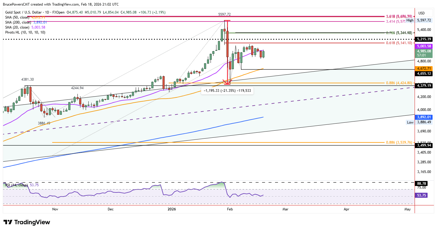 Current Stalemate: Gold tested resistance at the 20-day moving average ($5,003) this week, peaking at $5,011.