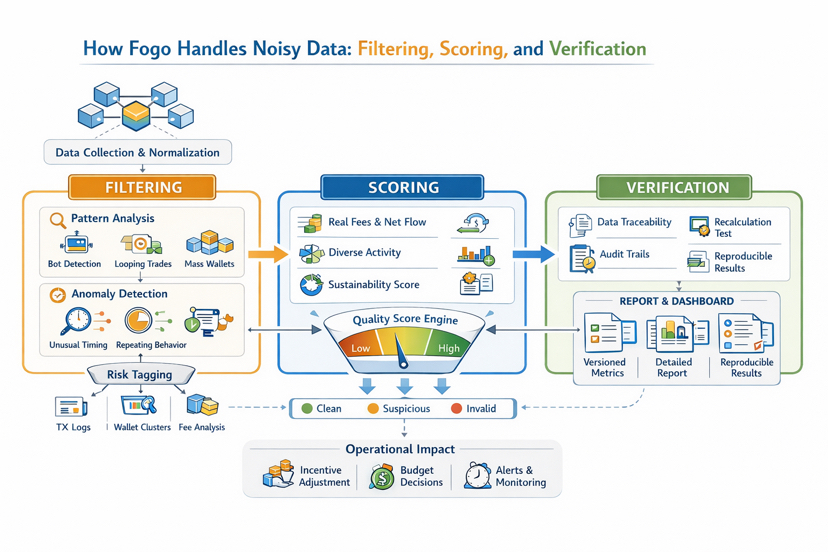 Fogo filtering layer should behave like a quality gate, not a broom that sweeps the surface clean. I want to see clustering based filtering, not just wallet by wallet rules. A cluster can be identified through machine like transaction timing, repeated action sequences, looping trades designed to manufacture volume, batches of newly created wallets doing the same behavior in the same time window, or groups of wallets interacting with only one action type to farm rewards. Good filtering also means risk tagging by levels, so data is not deleted outright but separated into tiers. Clean for health metrics, suspicious for monitoring, and invalid for exclusion from core indicators.