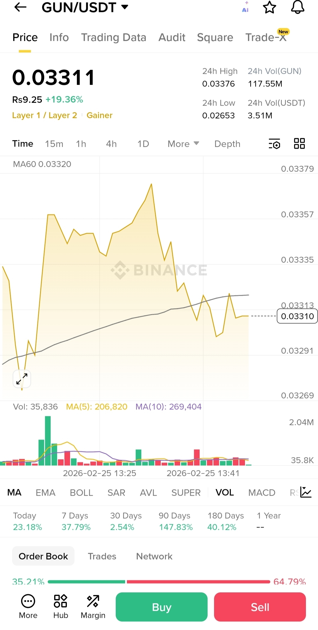 After an extended period of downside exhaustion, $GUN is now showing early signs of structural rebuilding on the lower timeframes. Price has entered a tight consolidation pocket between the $0.030 – $0.033 demand zone — an area previously associated with aggressive buyer absorption.