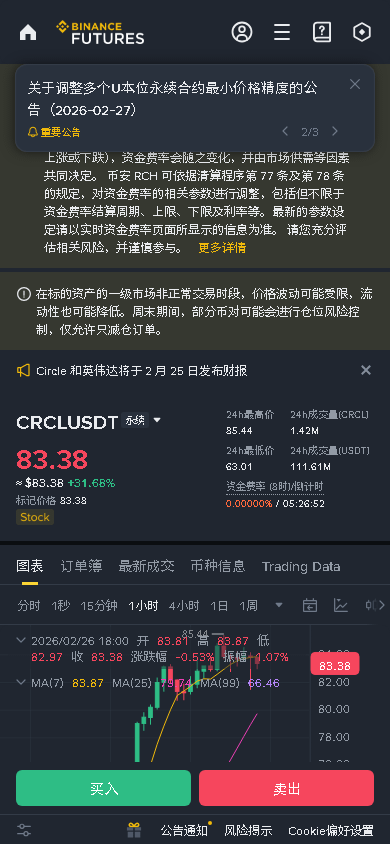 深度逻辑:价格在24小时内暴涨超30%,但持仓量(OI)保持稳定而非暴增,这排除了纯粹的空头踩踏,更像是主力资金持续流入推升。1H买/卖成交比在最新K线回升至0.54,显示买盘开始重新活跃。4H RSI高达86,虽处超买,但在强势趋势中可维持,重点观察1H级别的回调入场机会。下方83.2-83.3区间有巨量买单堆积,构成强力支撑墙。