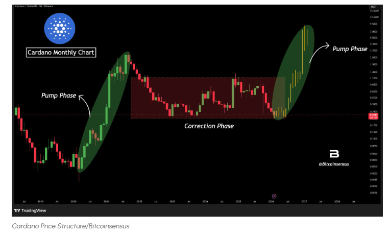 A Cardano está se desenvolvendo bem dentro de uma fase de acumulação em prazos mais altos, espelhando um padrão familiar que precedeu um movimento explosivo.