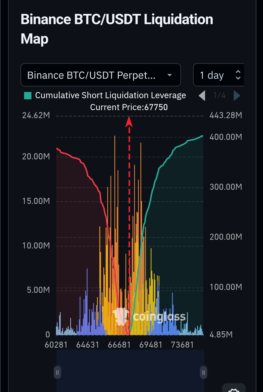 જ્યારે ભાવ $67,750 નજીક પહોંચે છે, ત્યારે આ રેખા ઝડપથી ઉપર તરફ વળે છે, જે "short squeeze" ની ઘટનાને દર્શાવે છે.