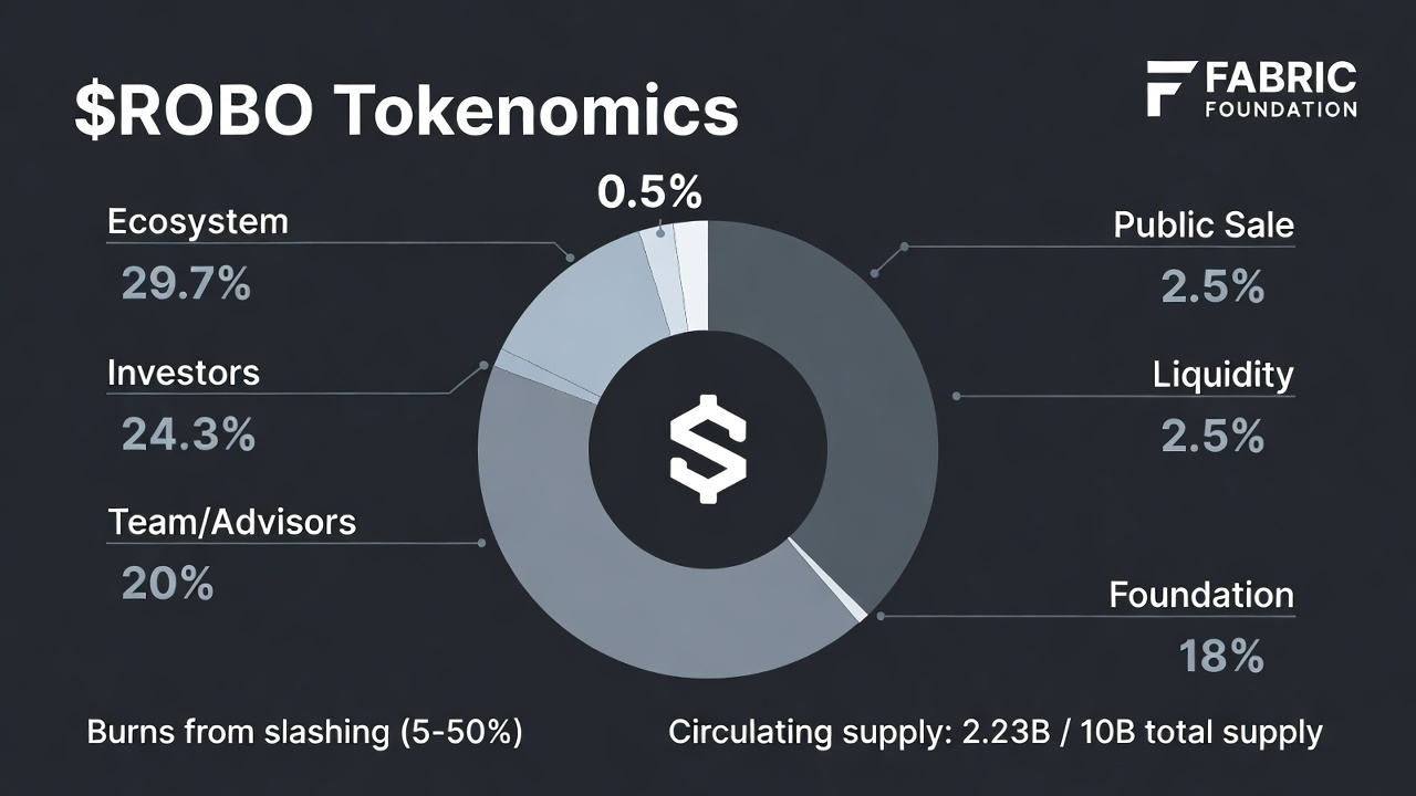 ROBO caps at 10 billion total, no endless inflation. Circulating supply hit 2.23 billion at launch (22.3%), with allocations like 29.7% for ecosystem (part unlocked) and 20% for team (vesting over 36 months post-cliff).