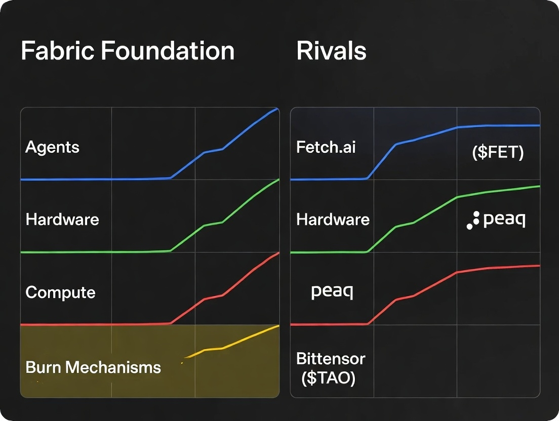 DePIN robotics pits ROBO against Fetch.ai ($FET) for agent dealings and peaq for hardware nets. Bittensor ($TAO) incentivizes AI compute, but ROBO's burn-enforced bonds target physical reliability.