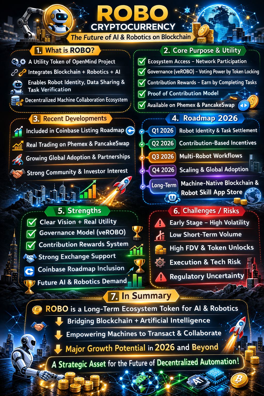 ROBO is positioned as a long-term ecosystem token for AI-robotic coordination rather than a speculative coin. Its inclusion in major exchange roadmaps and evolving contribution-based rewards reflect depth in design. It remains early stage, with adoption and technological milestones unfolding throughout 2026 and beyond.