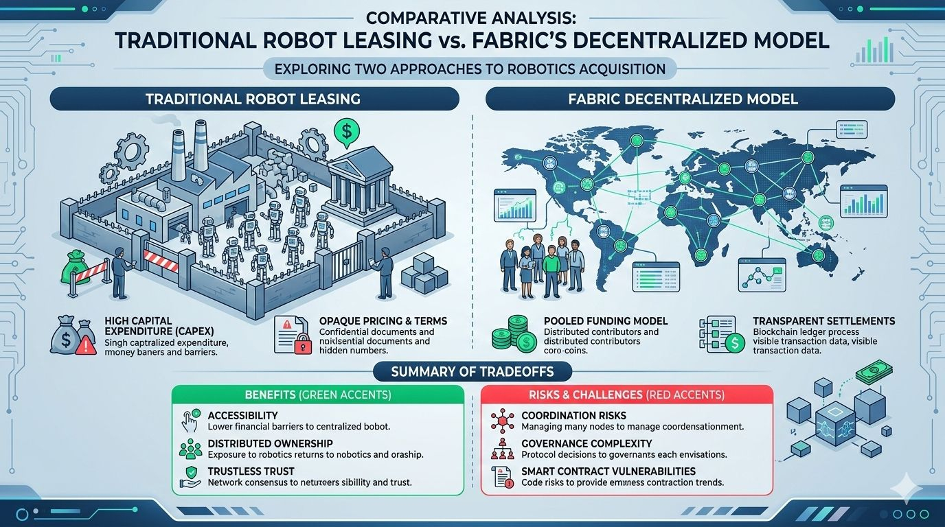 Compare this to traditional robot leasing, like those offered by companies in the humanoid market, where annual costs can hit $100,000 per unit through bilateral contracts with manufacturers. Those models rely on private capital for upfront expenses and internal teams for operations, leading to higher barriers for entry and less flexibility. Fabric flips this by decentralizing funding and ops—stablecoin deposits democratize access, and blockchain verification ensures transparent task allocation. However, Fabric introduces tradeoffs in incentive structures: while traditional leasing guarantees dedicated support, Fabric depends on community participation, which could lead to variability in uptime. Another angle is comparing to DePIN projects like Render for compute; Fabric extends this to physical robots, blending digital incentives with real-world hardware, but it demands stronger off-chain partnerships.