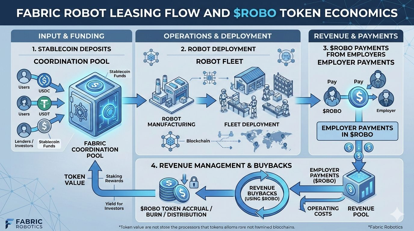 In the Fabric ecosystem, robot leasing operates through a decentralized coordination layer. It starts with users depositing stablecoins into pools that fund the purchase and deployment of robot fleets. The community then takes on operational roles—think charging stations, maintenance schedules, routing algorithms, and compliance checks—all governed by the protocol. Employers who need robot services pay in $ROBO, the native token, which handles settlements for completed tasks. This creates a marketplace where robots are effectively leased out on-demand, with fees flowing back to support the network. It's not about owning hardware individually; it's collective allocation, ensuring robots are utilized efficiently without massive upfront capital from any single entity.