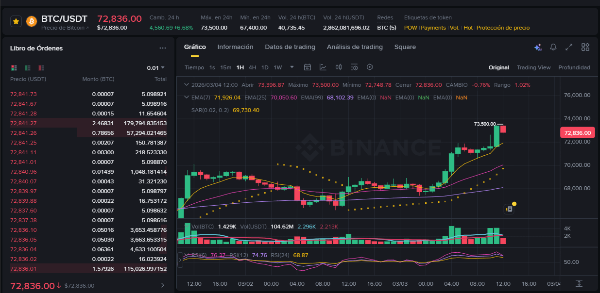 Stop Loss (SL): $71,800. Por debajo de la EMA(25) en 15m ($71,620) y del SAR Parabólico para proteger el capital ante una reversión brusca.