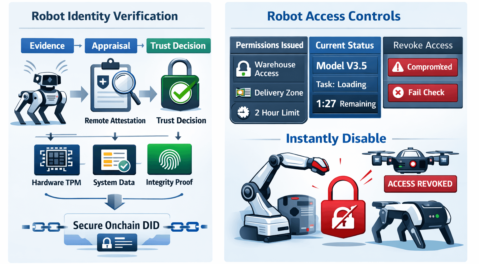鏈上身分是這個系統的核心組成部分。每個機器人都會獲得一個去中心化的身份,代表的是實體設備而非個人。該身份可以證明機器人運行的軟體以及是否滿足運行要求。可以授予機器人特定位置和有限時間段的權限。如果機器人未能通過驗證檢查,則可以立即撤銷其存取權限。