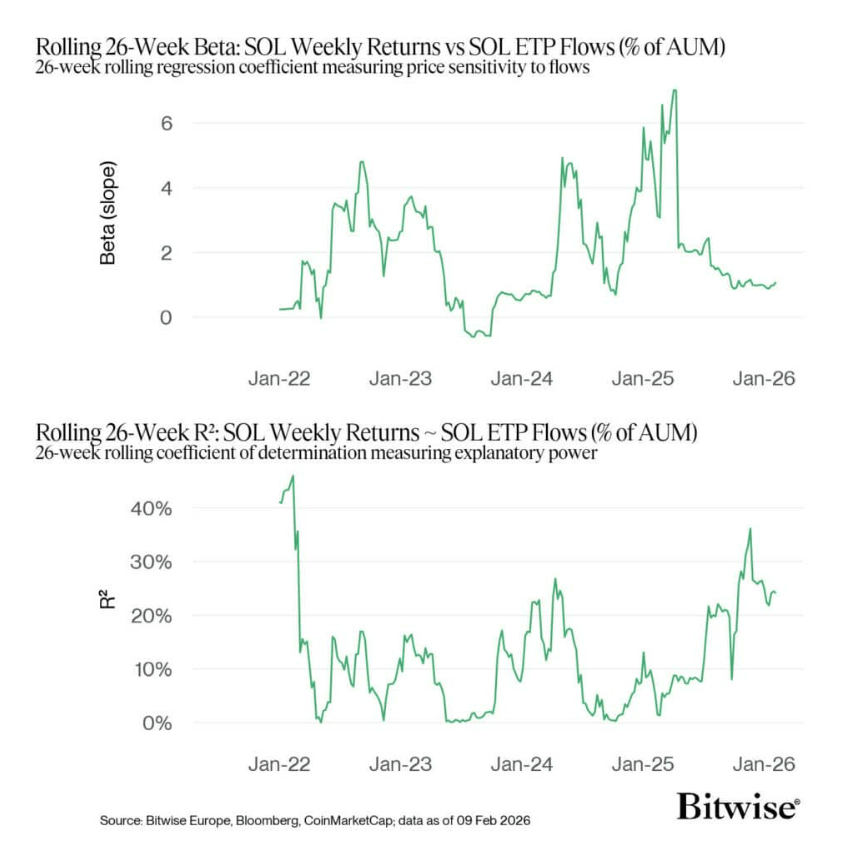 根据 Bitwise 的研究,目前 ETF 资金流动大约可以解释 SOL 价格波动的25%。换句话说,现在 SOL 价格的四分之一波动,已经直接受到 ETF 资金的影响。