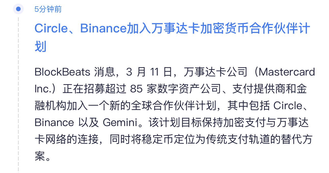 万事达卡又搞了个大动作,把Circle、币安、Gemini这些加密圈的“顶流”都拉进了一个新成立的全球合作伙伴计划。名单里一共85家公司,随便拎出来几个都是业内熟脸。