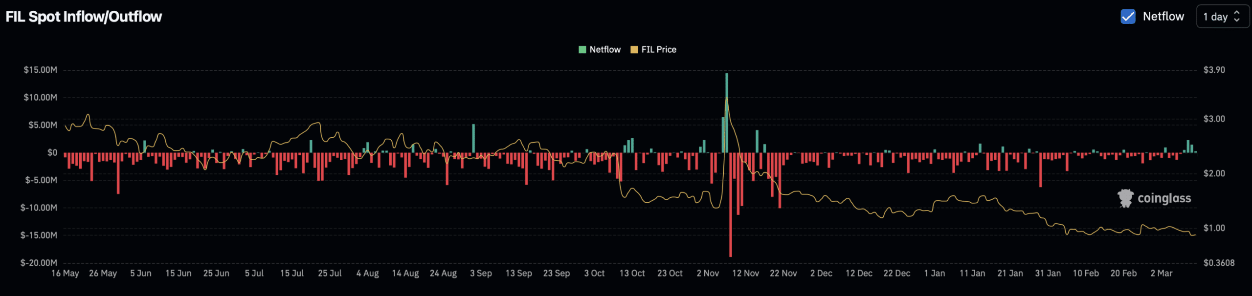 现货资金流出的连续性也反映了投资者对FIL短期前景的悲观态度。如果抛售持续,FIL的价格可能会进一步下行,整体市场前景也会受到影响。