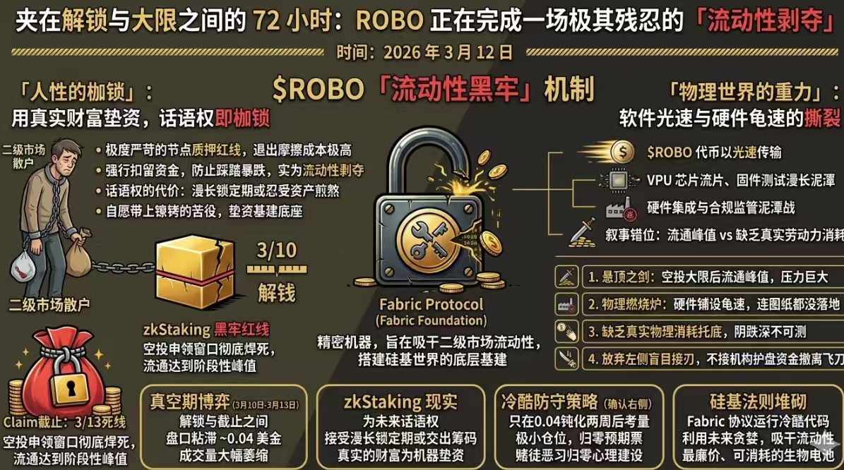 对于 $ROBO 的持有者来说,这过去的两天以及即将到来的明天,就像是被按在水底无法呼吸的极刑。3 月 10 日,早期质押筹码的枷锁刚刚解开;而明天(3 月 13 日),则是空投申领窗口彻底焊死的终局。
