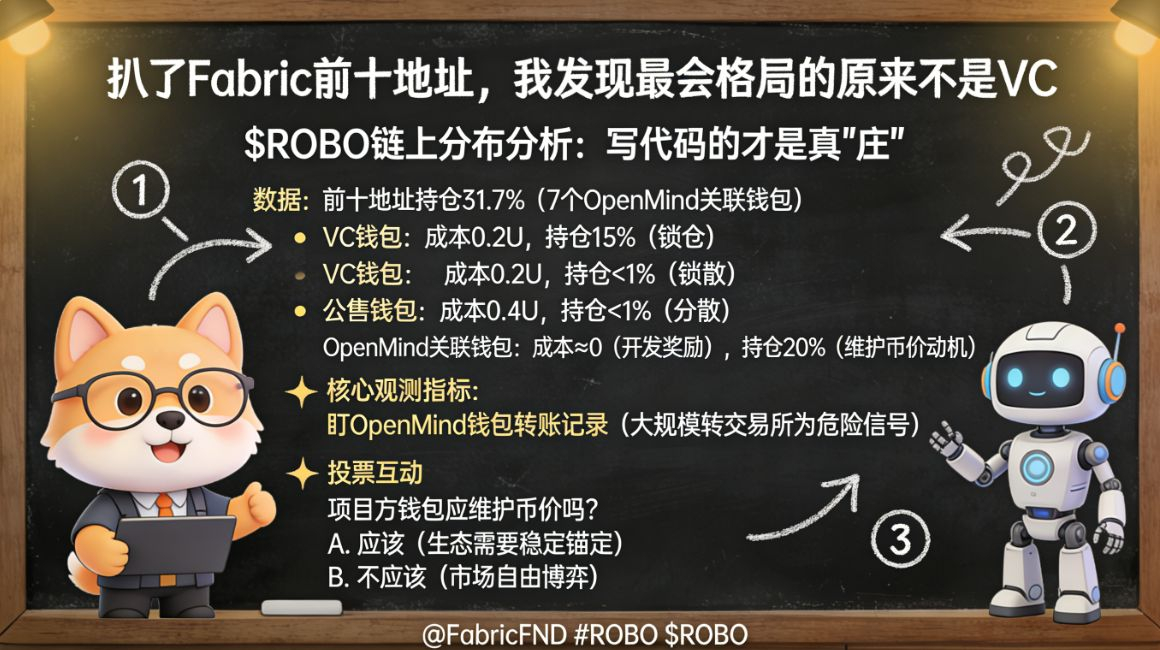有个习惯,每次新币上线我都会去扒一扒持币地址。昨天闲着没事扫了一遍 $ROBO 的链上分布,发现一个有意思的事——前十地址持仓占比31.7%,但其中7个是OpenMind关联的钱包 。