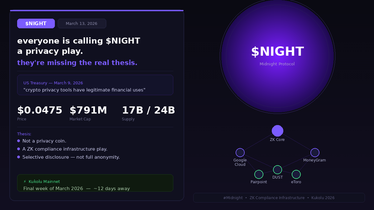 A partir de hoje, 13 de março de 2026, $NIGHT está sendo negociado em torno de $0.0475 com uma capitalização de mercado de aproximadamente $791 milhões. A oferta circulante é de 17 bilhões de um total fixo de 24 bilhões. A janela antes do mainnet é de cerca de 12 dias. O relatório do Tesouro foi divulgado há quatro dias. A maioria das pessoas está conectando essas duas coisas lentamente. Eu acho que elas deveriam se conectar mais rápido.