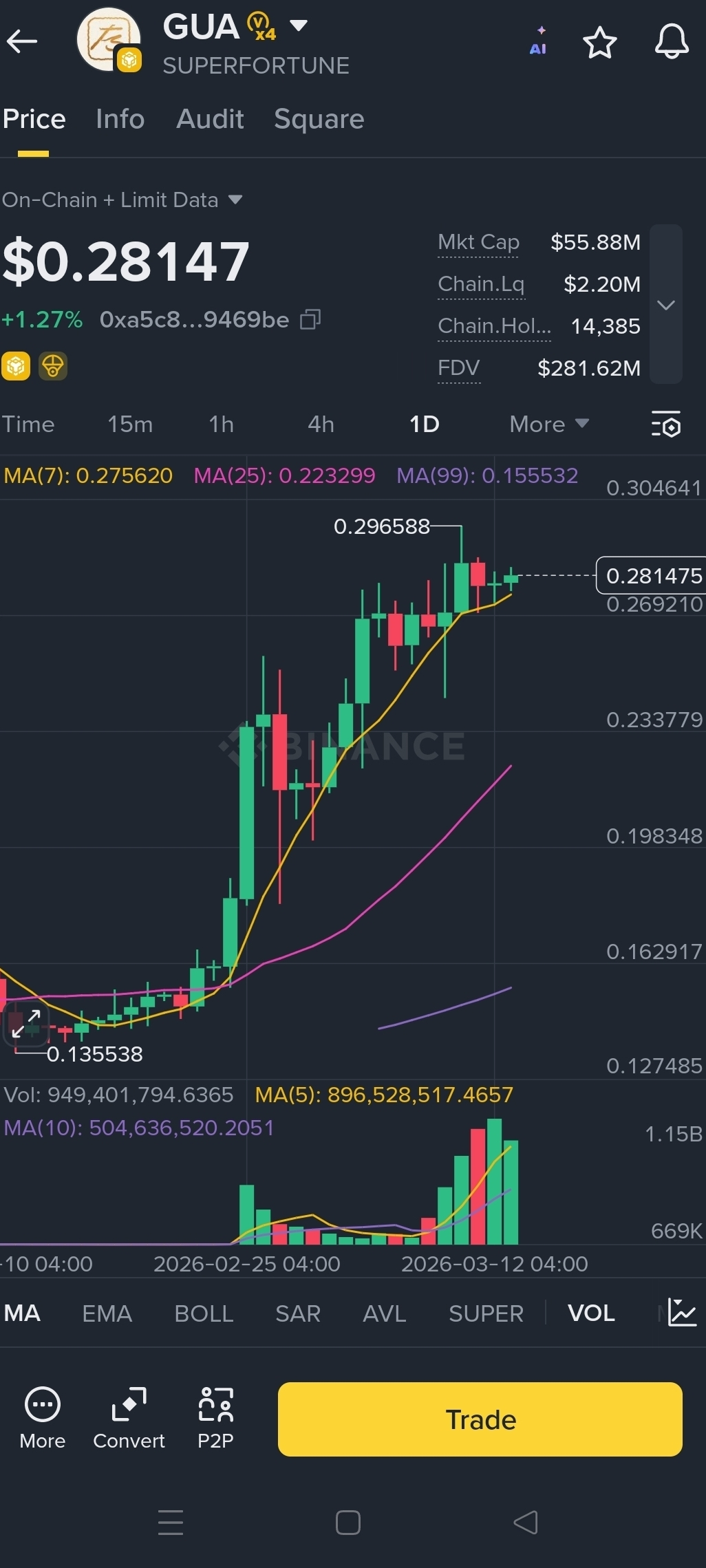 The price of $GUA A Token has shown impressive bullish momentum recently, climbing to around $0.28 and approaching the important $0.30 resistance level. Strong buying pressure and rising trading volume suggest that investors are gaining confidence in the asset. The daily chart shows a clear upward trend, with the price moving above key moving averages such as MA(7) and MA(25). This indicates that short-term momentum is currently controlled by buyers. As the market cap continues to grow and trading activity increases on Binance, many traders are watching closely to see whether GUA can maintain this upward momentum.