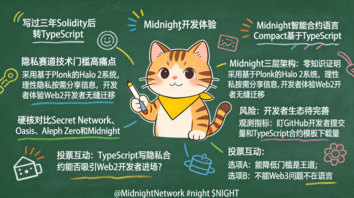 Midnight打的就是这个痛点——用TypeScript写隐私合约。TypeScript是目前Web2开发者的主流语言,全球有几百万开发者会用。这意味着Midnight的开发者入门门槛,比Solidity、Rust低一大截。