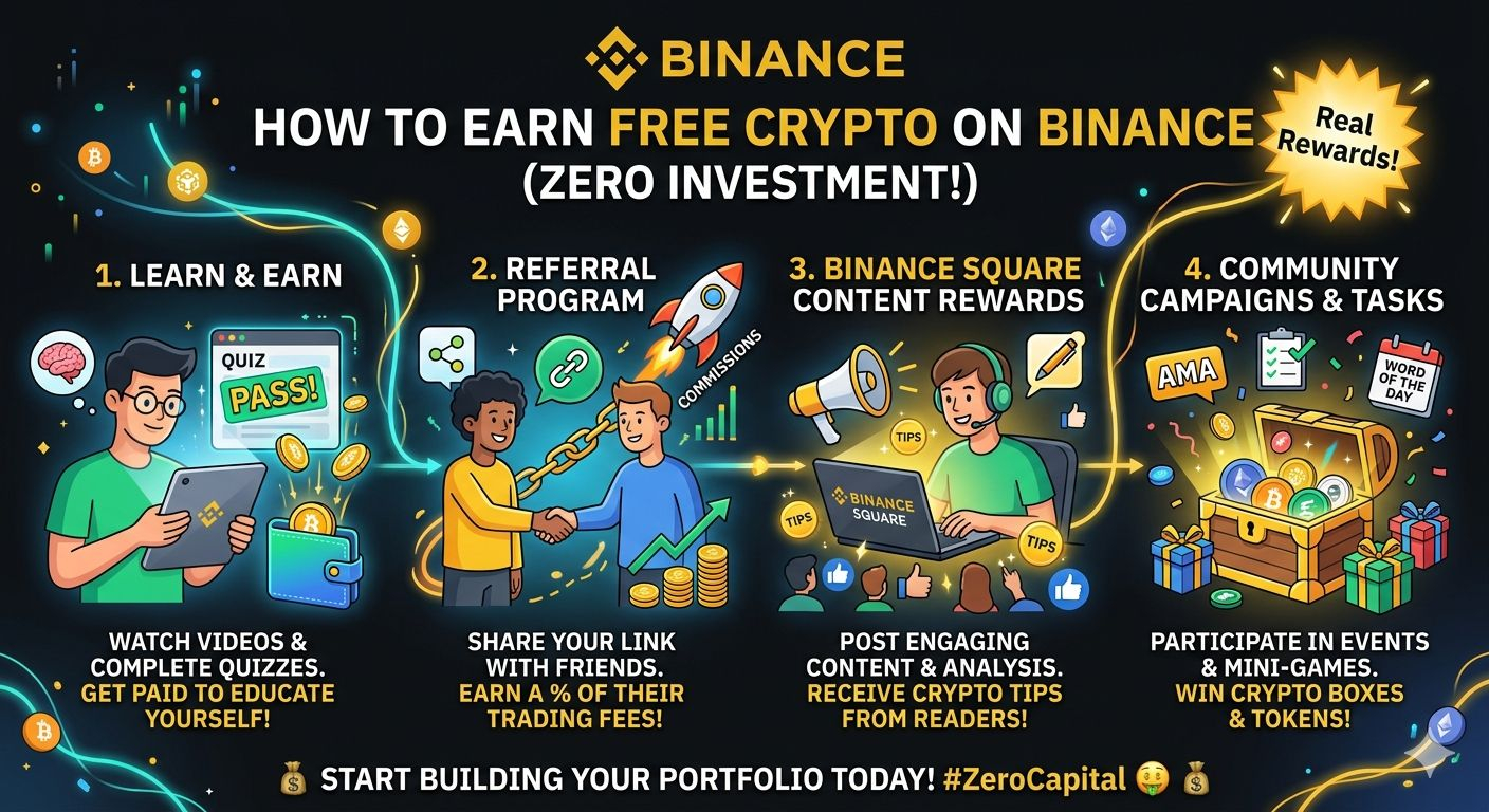 Many people ask if it's possible to earn crypto without risking their own money. The answer is YES! Binance offers several amazing ways to build your portfolio with absolutely zero investment. Here are the top methods:
