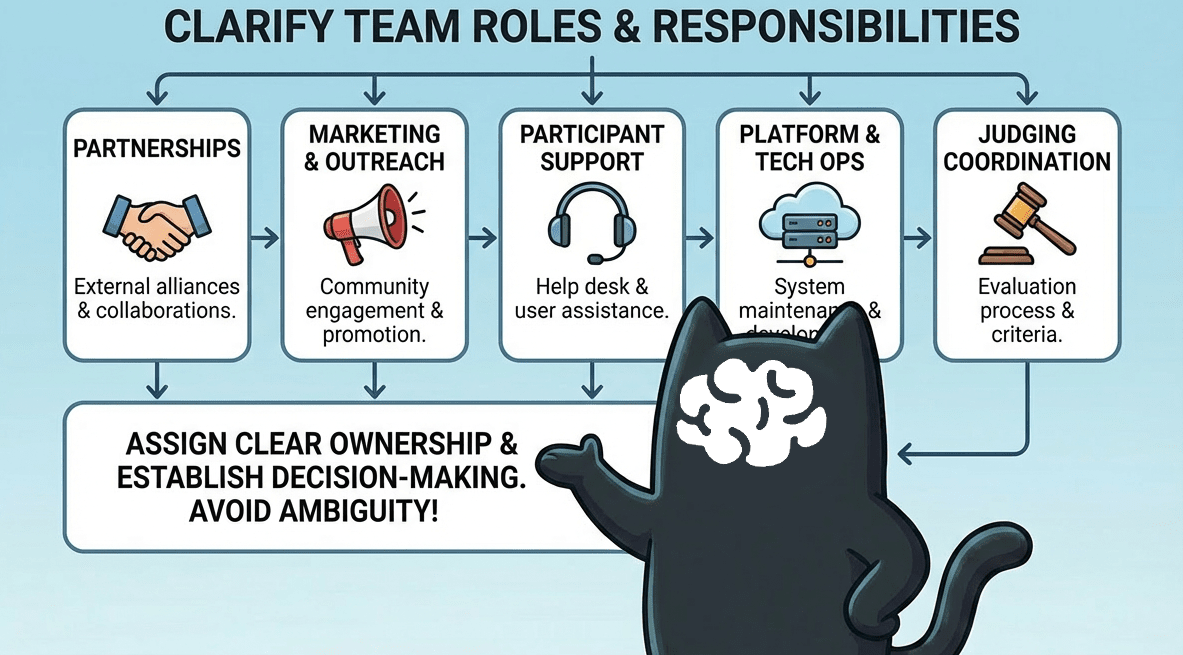 Se você está construindo uma equipe do zero ou trabalhando dentro de uma organização existente, tenha clareza sobre quem faz o quê. Os papéis típicos incluem parcerias, marketing e alcance comunitário, suporte ao participante, operações de plataforma e técnica, e coordenação de julgamento.