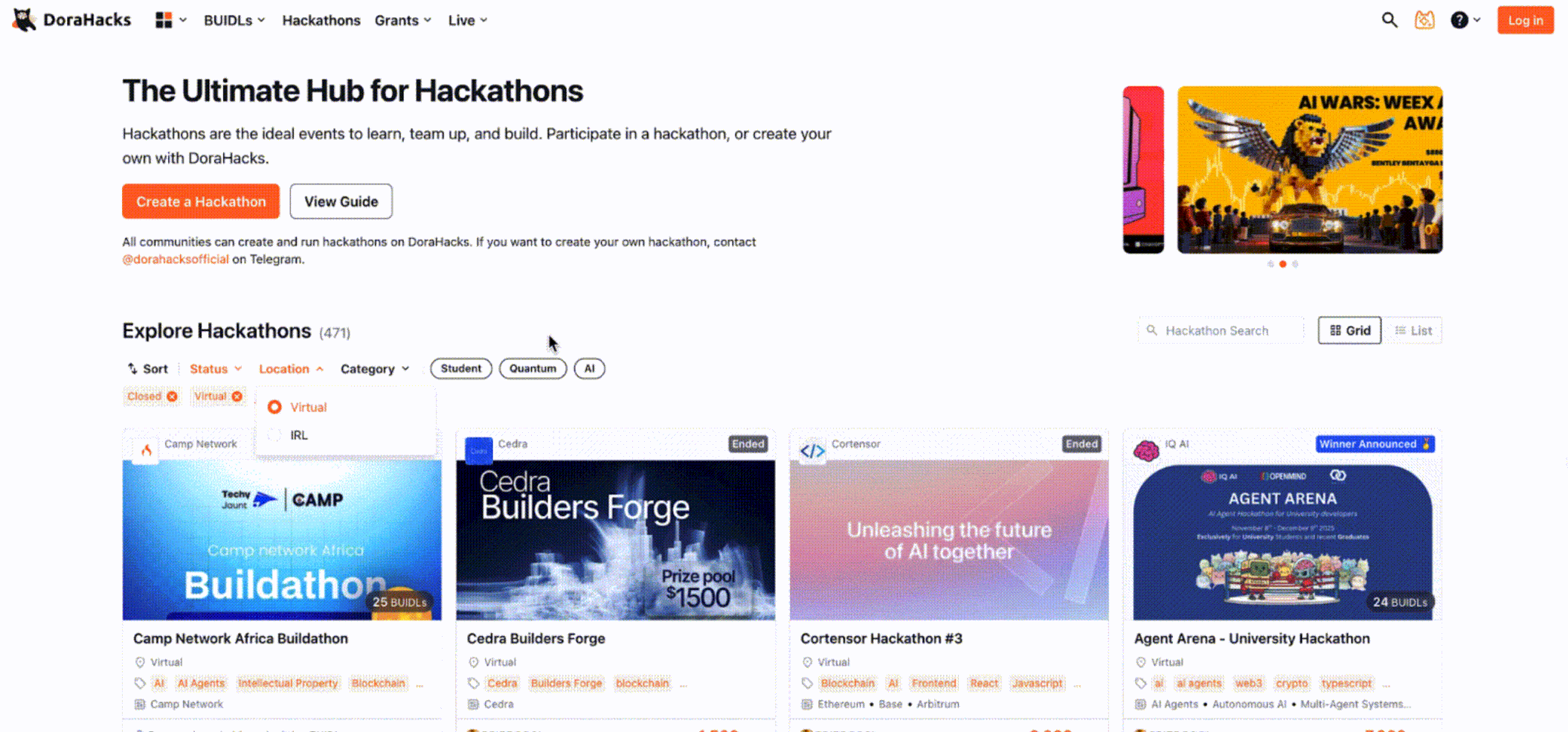 DoraHacks (https://dorahacks.io) é a principal comunidade global de hackathons e plataforma de incentivo para desenvolvedores de código aberto. A DoraHacks fornece kits de ferramentas para qualquer pessoa organizar hackathons e financiar startups em fase inicial do ecossistema.