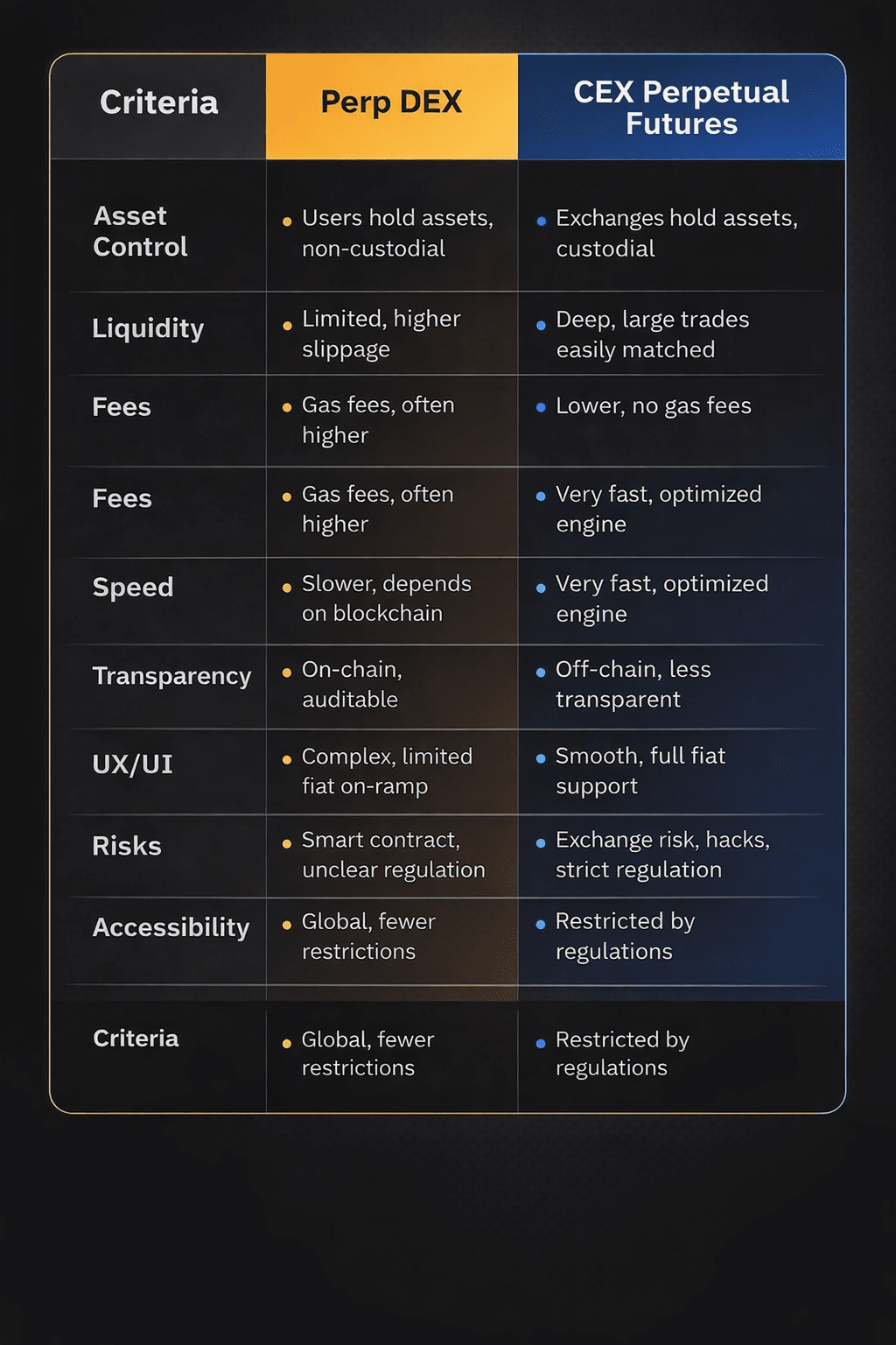 Por outro lado, os DEXs Perp podem sofrer com taxas de gás ou transação mais altas (dependendo da cadeia), maior latência (especialmente se as operações forem totalmente on-chain), mais deslizamento para grandes negociações se a liquidez for insuficiente e, às vezes, um suporte ao cliente menos refinado ou recursos periféricos (por exemplo, integração com fiat ou interface simples).
