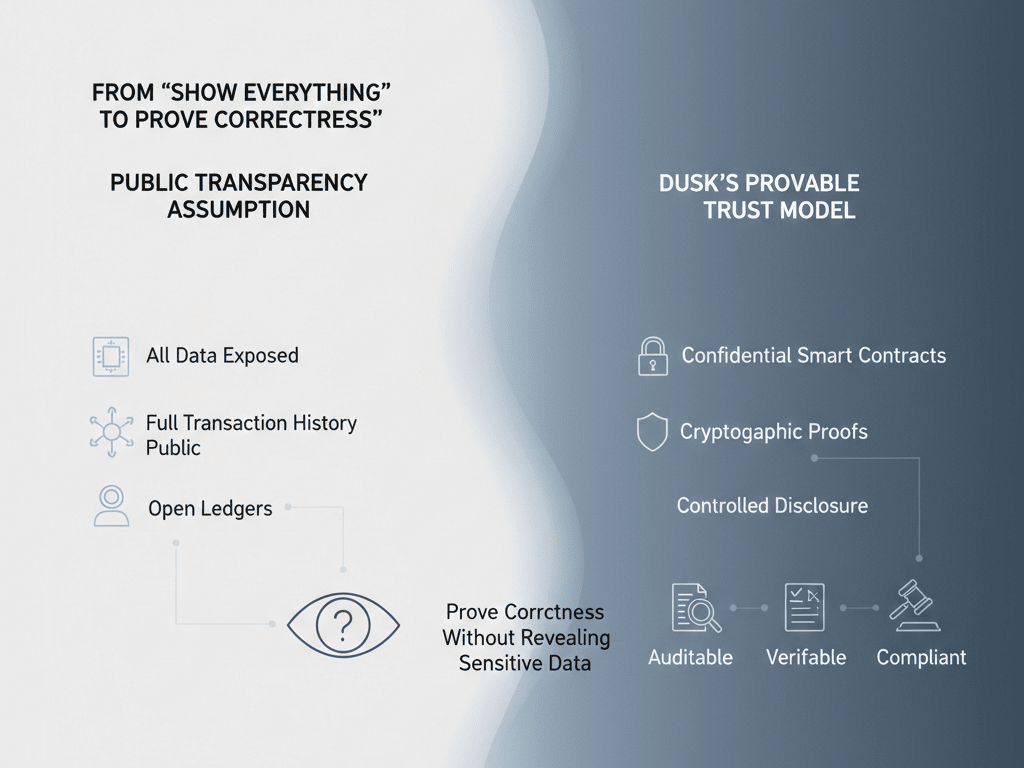 Privacidade e conformidade não são opostas, mas complementares. A filosofia de design do Dusk é simples, mas poderosa. Em finanças reais, transparência não significa 'tudo público'. Dados de acionistas, posições, detalhes de liquidação - tudo isso é restrito e essa restrição não quebra a confiança, mas a constrói. A arquitetura do Dusk é construída em torno dessa realidade: contratos inteligentes confidenciais são executados, dados sensíveis não são públicos, mas quando uma auditoria ou verificação legal é necessária, a correção pode ser provada - sem revelar todo o sistema. Por isso, o Dusk é relevante para bancos, exchanges reguladas e instituições financeiras. Aqui, a fonte de confiança não é 'mostre tudo', mas 'as regras foram seguidas? - prove'.