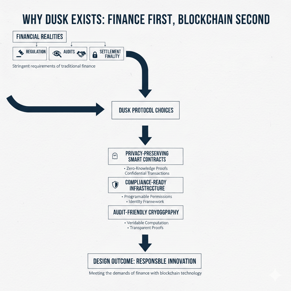 Propósito primeiro, ruído depois. O Dusk se define como uma blockchain de Camada-1 onde privacidade e conformidade são parte da camada base - não são recursos adicionados depois, mas sim a fundação. Acesso ao capital, negociação de ativos ou fluxos de trabalho de liquidação - o objetivo é que tudo ocorra na blockchain, sem expor dados confidenciais. A mensagem central da história oficial é a mesma: uma indústria financeira onde empresas e indivíduos possam levantar capital, negociar ativos e acessar serviços - sem comprometer a privacidade. Essa abordagem é para aqueles que desejam não apenas especular sobre finanças, mas operá-las.