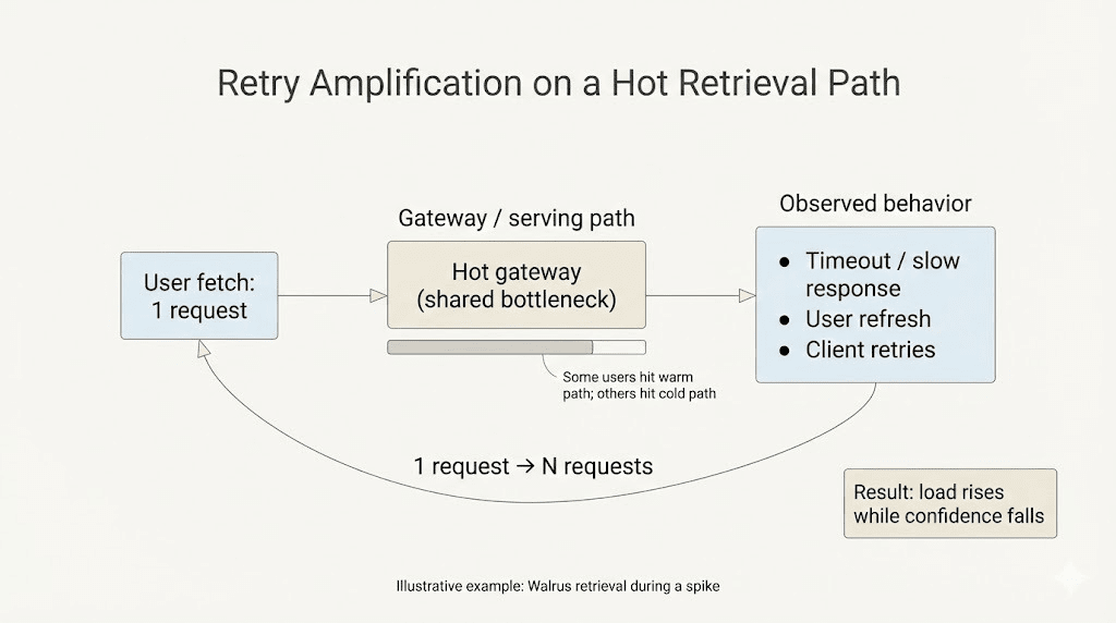 No Walrus, essa imprecisão vem de lugares mundanos. O caminho de alguém está ocupado. Um gateway está quente. As tentativas se acumulam e de repente o "um arquivo" se torna dez solicitações. Ao mesmo tempo, o trabalho de reparo está consumindo largura de banda e atenção porque o sistema está tentando se manter acima do limite, não fazer sua interface parecer suave.