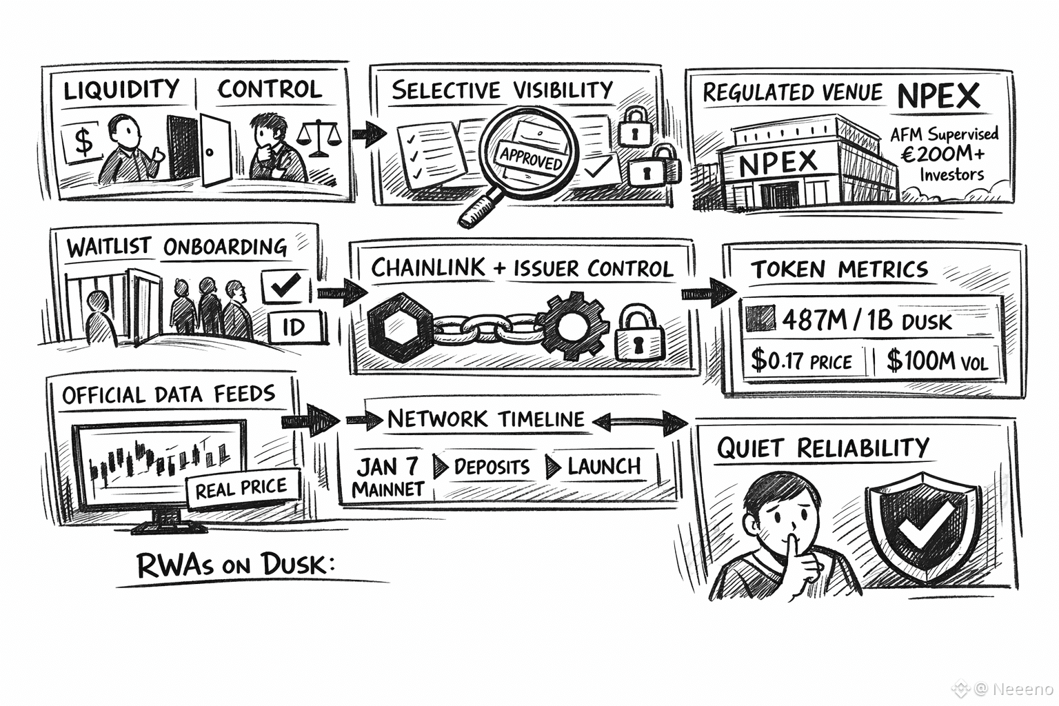 It’s also worth noticing how much of RWA liquidity depends on something boring: data that people will accept in a dispute. Traders love price feeds when things are calm. Compliance teams love them when things aren’t. Dusk and NPEX describing themselves as official data publishers for regulated-grade information, using on-chain delivery of official exchange data and low-latency streams, is the kind of infrastructure move that only feels exciting if you’ve ever watched a market argument spiral because the parties couldn’t agree on what the “real” price was at the decisive moment. When RWAs become liquid, disagreements don’t disappear; they accelerate. So the system has to be built around reducing ambiguity without overexposing participants.