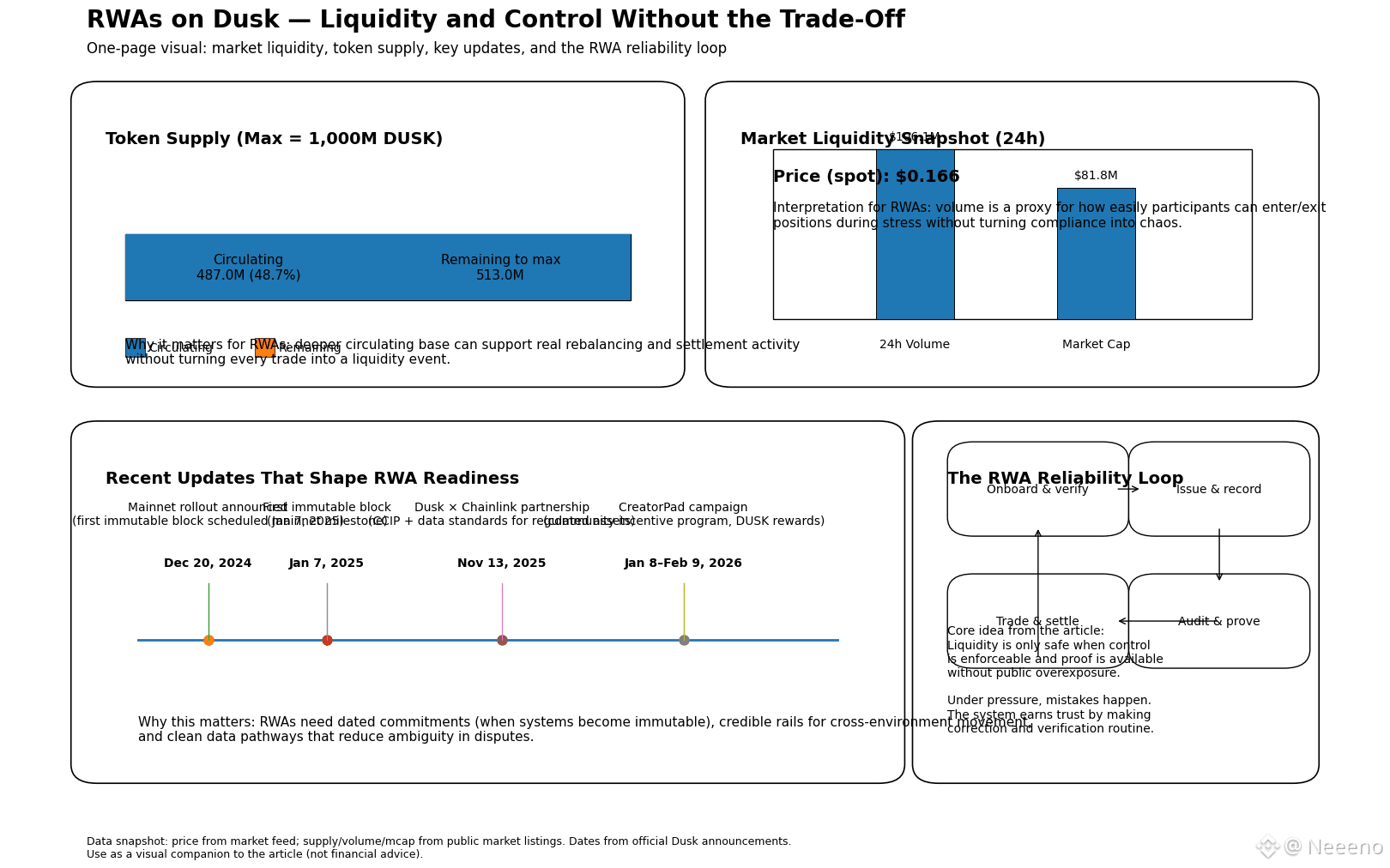 Token behavior becomes part of this story whether people like it or not, because the token is not just a chart—it's also a stress test of attention, liquidity, and participant confidence. As of January 18–19, 2026, DUSK has been trading around $0.17, with reported 24-hour volume around $100M+ and circulating supply reported at roughly 487 million against a maximum supply of 1 billion, placing the fully diluted value around double the spot market cap depending on venue and timing. These numbers matter less as bragging rights and more as an indicator that the market can actually absorb activity without collapsing into illiquid fragility. If you’re serious about RWAs, you eventually have to care about market depth, because thin liquidity doesn’t just punish speculators—it punishes real users trying to rebalance exposure responsibly.