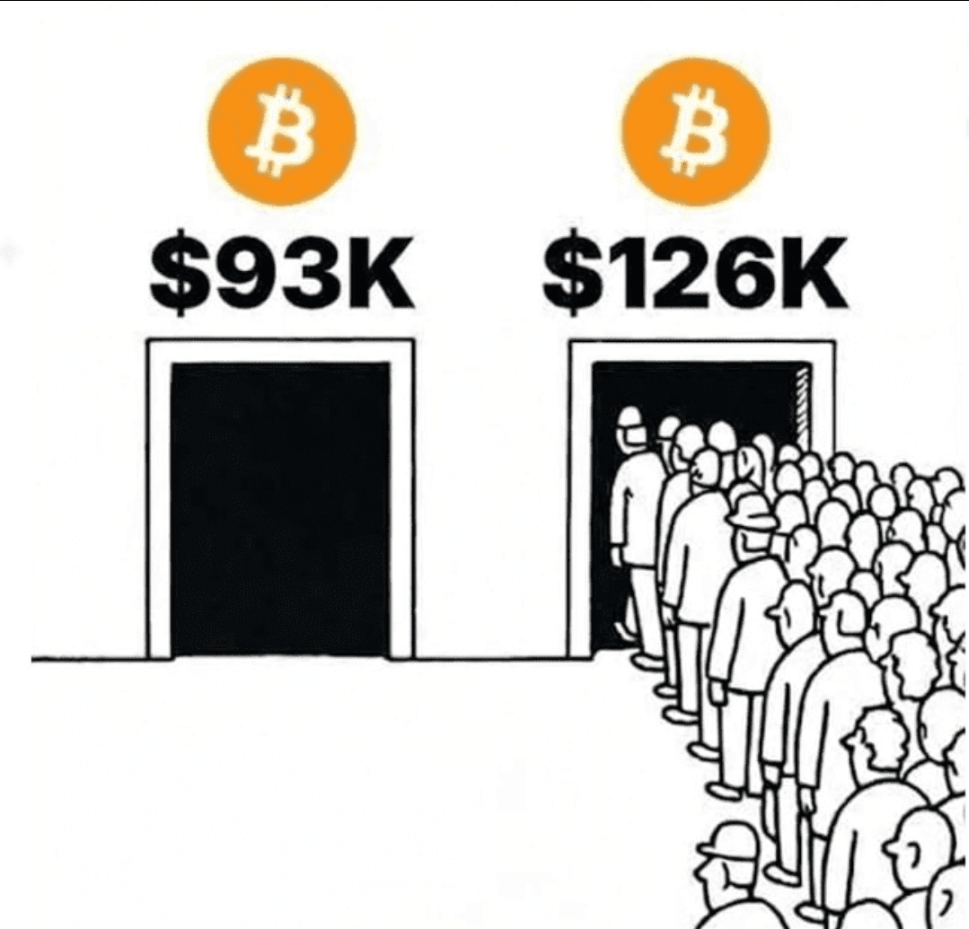 Neste momento, a razão mais comum pela qual as pessoas evitam comprar é simples: medo de outra queda. O pensamento de que o Bitcoin pode cair ainda mais cria paralisia. Ironicamente, esse mesmo medo desaparece quando o preço está alcançando novas máximas, sendo substituído pela urgência e FOMO. A partir daí, o risco é maior, não menor.