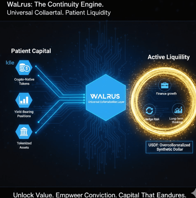 Em vez de tratar a liquidez como uma ferramenta de emergência, Walrus a trata como uma condição contínua do capital. O protocolo é construído em torno de uma observação simples, mas poderosa. A maioria dos detentores não quer abandonar seus ativos. Eles acreditam neles. Eles querem exposição, não liquidação. No entanto, os mercados se movem, oportunidades surgem e o capital deve permanecer utilizável. Walrus entra nessa tensão e a resolve não com alavancagem ou complexidade, mas com estrutura.