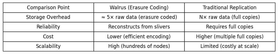 O plano de dados é onde a engenharia interessante reside. O Walrus não armazena cópias completas de arquivos entre os nós (replicação completa), porque a replicação se torna cara rapidamente. Em vez disso, usa codificação de apagamento; um blob é codificado em muitos pedaços redundantes menores chamados “fatias”, e essas fatias são distribuídas por um comitê de nós de armazenamento. Assim, a rede pode perder algumas peças e ainda reconstruir o blob original. A documentação do Walrus descreve isso como uma abordagem custo-eficiente onde o overhead de armazenamento é aproximadamente 5× o tamanho dos dados brutos, trocando alguma redundância por confiabilidade sem o custo extremo de copiar tudo em todos os lugares.