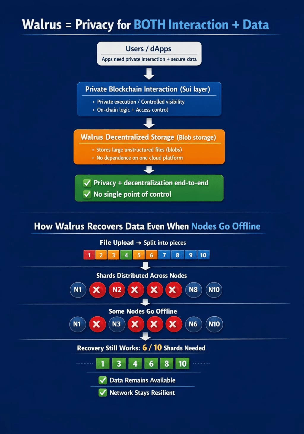 Walrus introduz um modelo descentralizado de armazenamento de dados que é altamente seguro e eficiente, capaz de lidar com enormes volumes de dados. Ele aproveita a codificação de apagamento avançada e uma rede distribuída de provedores de armazenamento para garantir a disponibilidade dos dados mesmo quando alguns nós ficam offline. Essa abordagem melhora significativamente a resiliência em comparação com sistemas de armazenamento centralizados tradicionais e também reduz os custos para desenvolvedores e usuários.