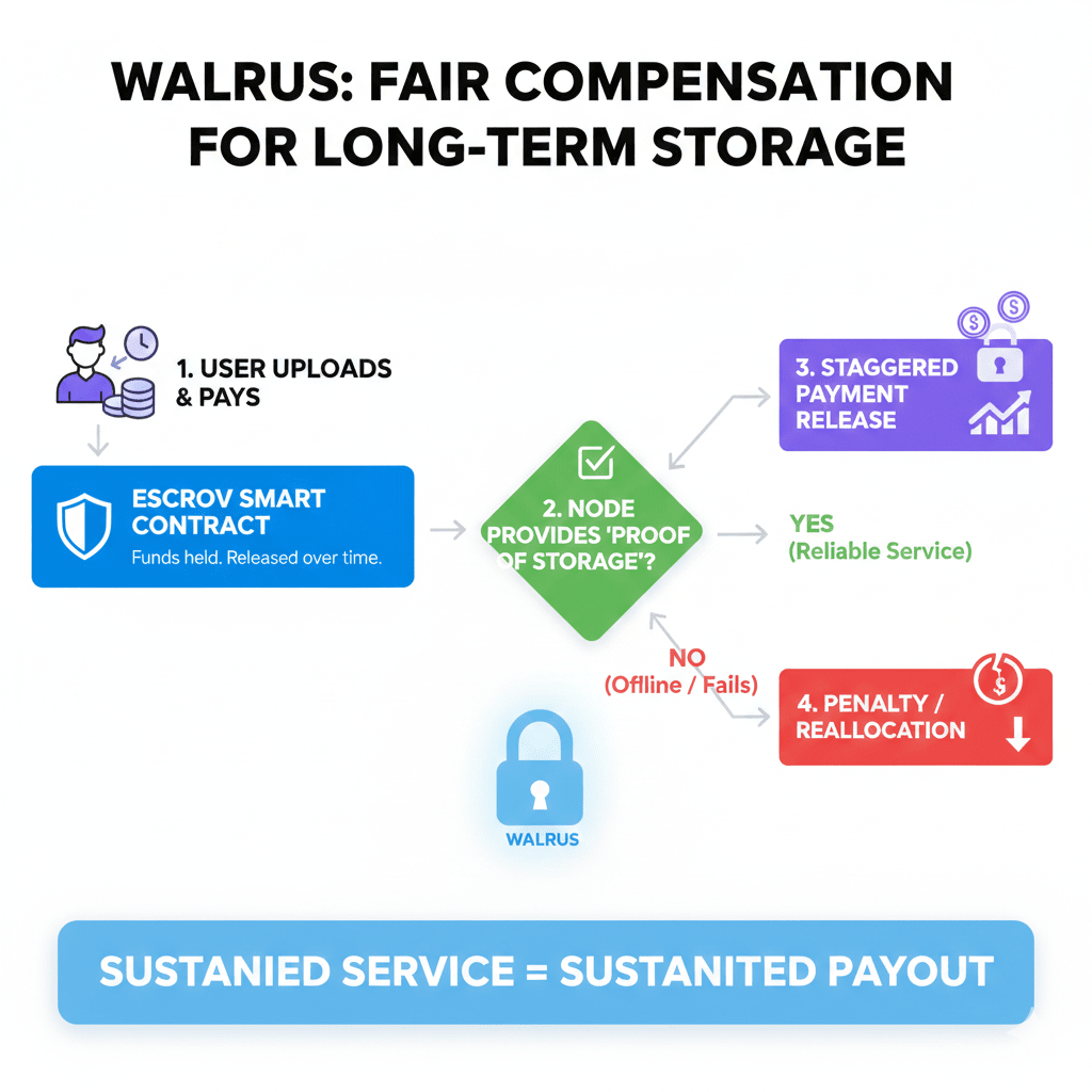 Quando eu explorei pela primeira vez como o Walrus lida com pagamentos de armazenamento a longo prazo, percebi que este é um daqueles problemas complexos de forma enganosa que muitos sistemas de armazenamento descentralizados ignoram. É fácil aceitar um pagamento antecipado e assumir que o trabalho está feito — mas, na realidade, armazenar dados por meses ou anos requer um esforço contínuo dos operadores de nós. Se a compensação for pré-paga, há pouco incentivo para os operadores manterem alta disponibilidade ao longo do tempo.