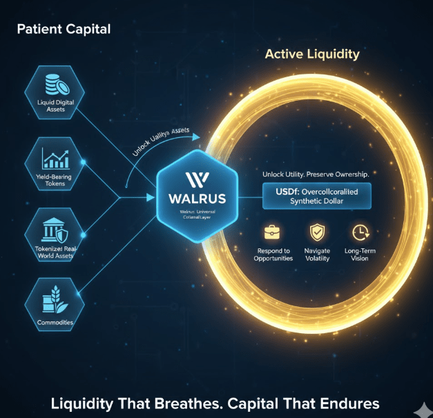 No cerne de Walrus está um princípio simples: o capital deve permanecer utilizável sem ser comprometido. O protocolo permite que os detentores depositem ativos digitais líquidos e ativos do mundo real tokenizados como colateral. Esses ativos não se tornam bloqueados ou inertes, eles permanecem produtivos, mantendo tanto valor quanto utilidade. A partir disso vem o USDf, um dólar sintético sobrecolateralizado. Ao contrário de muitos instrumentos em criptomoedas que prometem ganhos rápidos ou rendimento passageiro, o USDf é prático, estável e visível. Seu papel é fornecer liquidez que não exige sacrifício, para oferecer uma ponte entre convicção e ação.