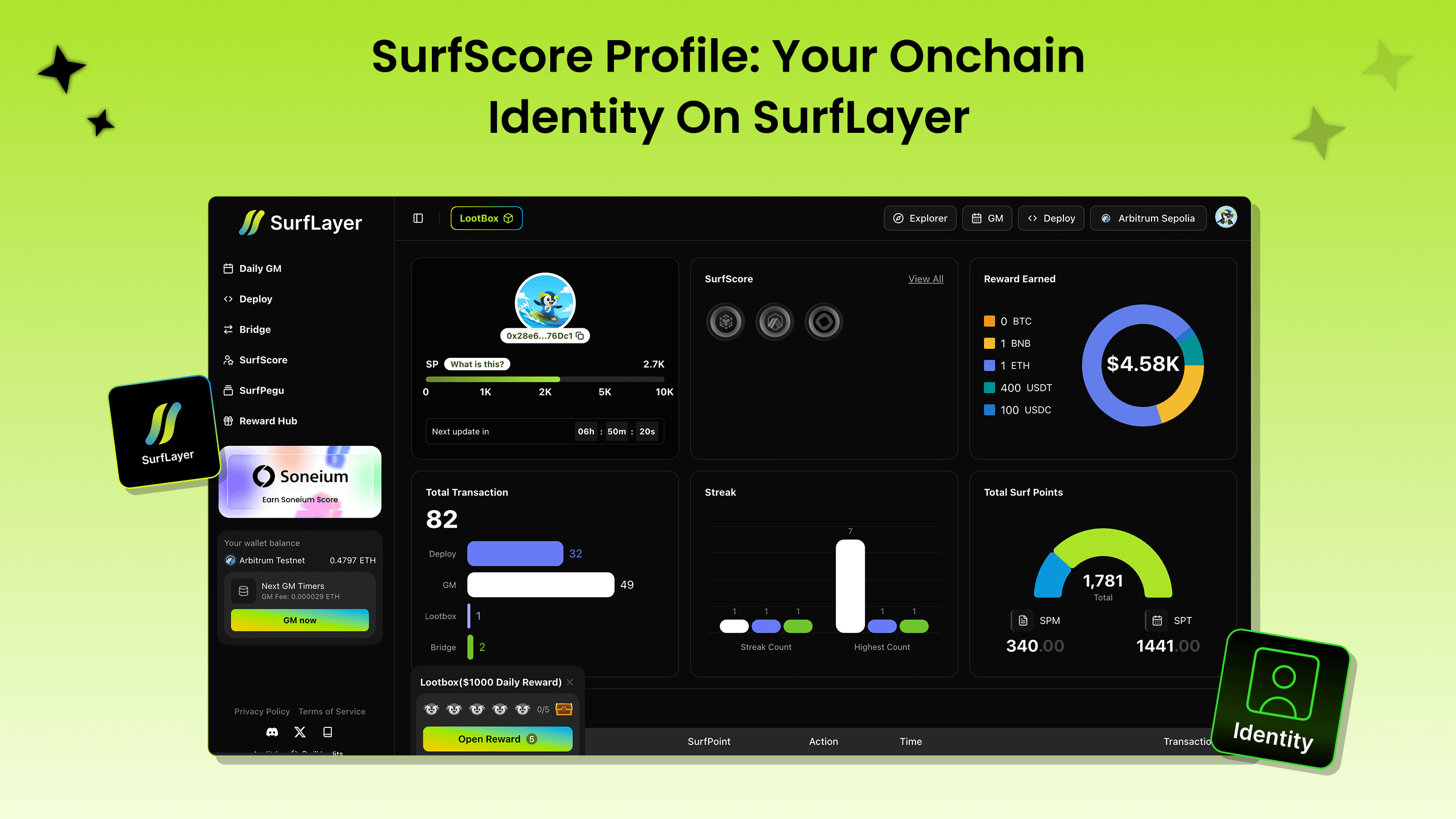 O Perfil SurfScore é onde toda a sua jornada onchain no SurfLayer se reúne.