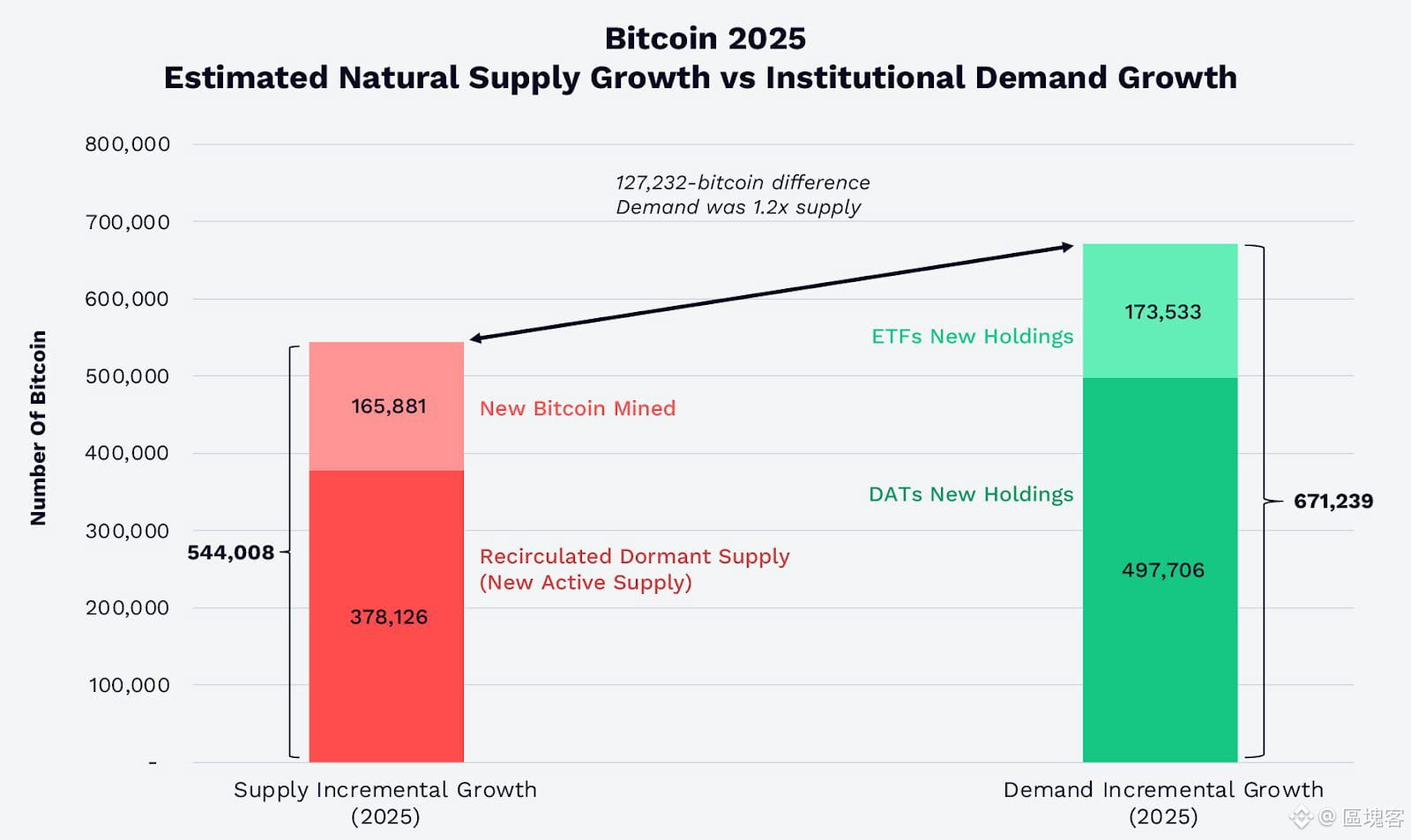 現貨比特幣 ETF 的規模化擴張重塑了市場的供需格局。如下圖所示,到 2025 年,美國比特幣現貨 ETF 和 DATs 吸收的比特幣數量是新挖比特幣和重新流入市場的休眠比特幣總和(活躍供應成長)的 1.2 倍。到 2025 年底,ETF 和 DATs 持有的比特幣總量超過流通總量的 12% 。儘管比特幣的需求成長超過了供應成長,但其價格卻下跌了,這似乎是受外部因素影響:10 月 10 日由軟體故障引發的大規模清算事件、對比特幣四年周期拐點的擔憂,以及圍繞量子運算威脅比特幣加密技術的負面情緒。